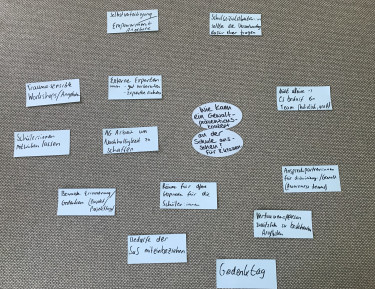 Mit unterschiedlichen Fragestellungen waren die Teilnehmenden immer wieder in Einzelarbeit, zu zweit oder in Kleingruppen aktiv. Beispielsweise reflektierten sie mit Hilfe eines Zeitstrahls, erst allein und dann mit anderen, ihre bisherigen Highlights und Lowlights in der Zusammenarbeit mit den Schulen und ihre Maßnahmen mit Schüler:innen. In einer anschließenden Runde gab es Raum sich selbst vor Augen zu führen, worauf man bisher stolz ist. In einer wertschätzenden Haltung der Runde tat es allen gut mit dem Blickwinkel aus dem Alltag in den Schulen herauszutreten und den Blick aufs große Ganze und die eigenen Leistungen zu legen. In dieser Runde gab es auch Raum dafür, den anderen eigene Erkenntnisse oder Ratschläge mitzugeben. Gerade für die Respekt Coaches, die noch neu im Programm sind, war das sehr hilfreich. Als häufigster Ratschlag tauchte Geduld haben auf und Reaktionen anderer nicht persönlich zu nehmen. Aber auch sehr konkrete Tipps wurden in der Runde geteilt und auf dem „Netzwerkspeicher“ konnten sich die Teilnehmenden gegenseitig mit hilfreichen Kontakten und Trägern in der Region versorgen. Häufige Herausforderung in den ländlichen Räumen ist die große Entfernung von Trägern in den Ballungsgebieten, die es schwer machen Akteur:innen an die Schulen zu holen. Welche Träger in ländlichen Gegenden aktiv sind oder auch weiter reisen und an die Schulen kommen, wurde ausgetauscht.