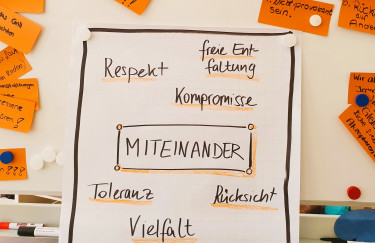 Die Schüler*innen diskutierten beim Workshop anhand einer Illustration, was in der Öffentlichkeit akzeptiert wird und was nicht. Sie haben besprochen, was sie für richtig erachten und auf welche Regeln sie sich in der Gruppe einigen können. Grundlage des Workshops war ein Konzept der Evangelischen Trägergruppe aus der Publikation "Alles Glaubenssache? - Illustrationen und Methoden zum Zusammenleben in Diversität", das von der JBR ergänzt wurde. So haben die Teilnehmenden die Gedanken und Ergebnisse in einem zweiten Schritt auf das Miteinander in der Schule und in ihren Klassen übertragen. Dabei wurden Kompromisse, Toleranz und Perspektivwechsel geübt.